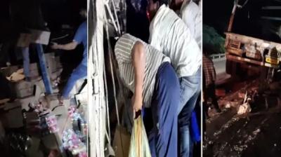 हादसे के बाद अफरा-तफरी: सड़क पर बिखरी शराब, भीड़ की लूट और पुलिस पर हमला