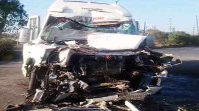 श्रद्धालुओं से भरी ट्रैवल्स बस कंटेनर से टकराई, हादसे में 1 की मौत, अन्य घायल